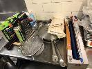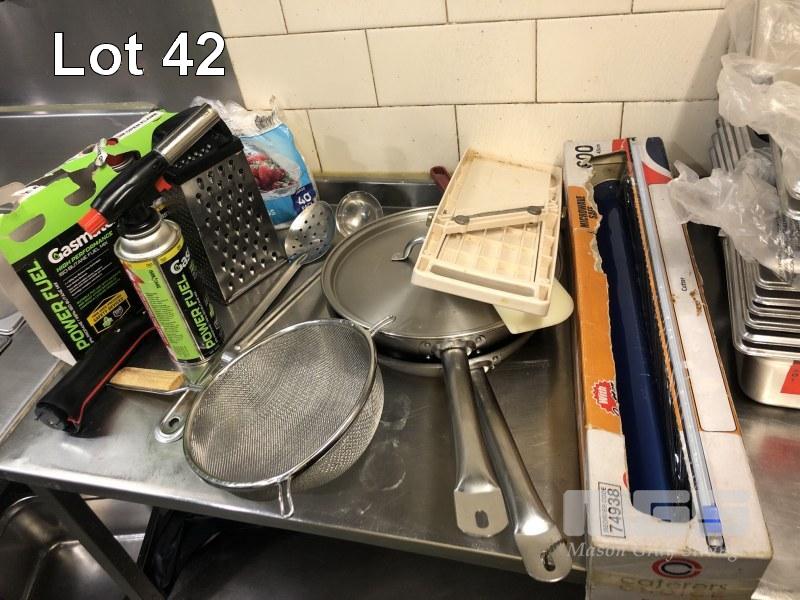 2 x STAINLESS STEEL FRY PANS, 16 x SMALL GASTRONORM TRAYS & ASSORTED KITCHEN UTENSILS