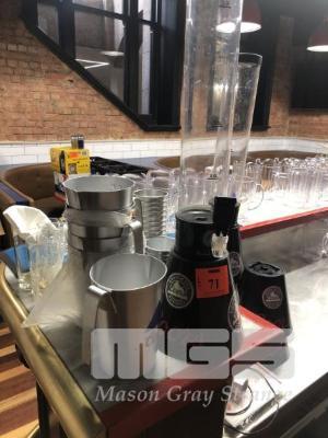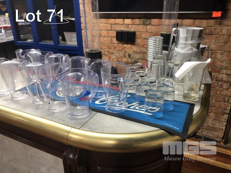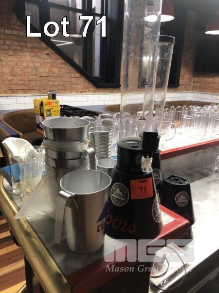 10 x PLASTIC BEER JUGS, 1140ml, ASSORTED RANDOM GLASSES, COORS, STAINLESS STEEL JUG & CUPS, ETC