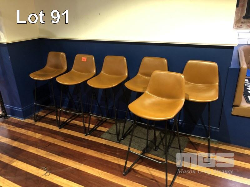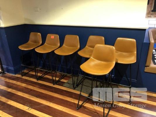 6 x BROWN VINYL BAR STOOLS WITH BACKREST, STEEL FRAME