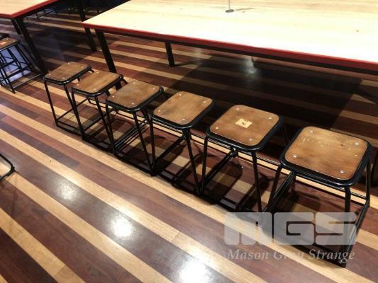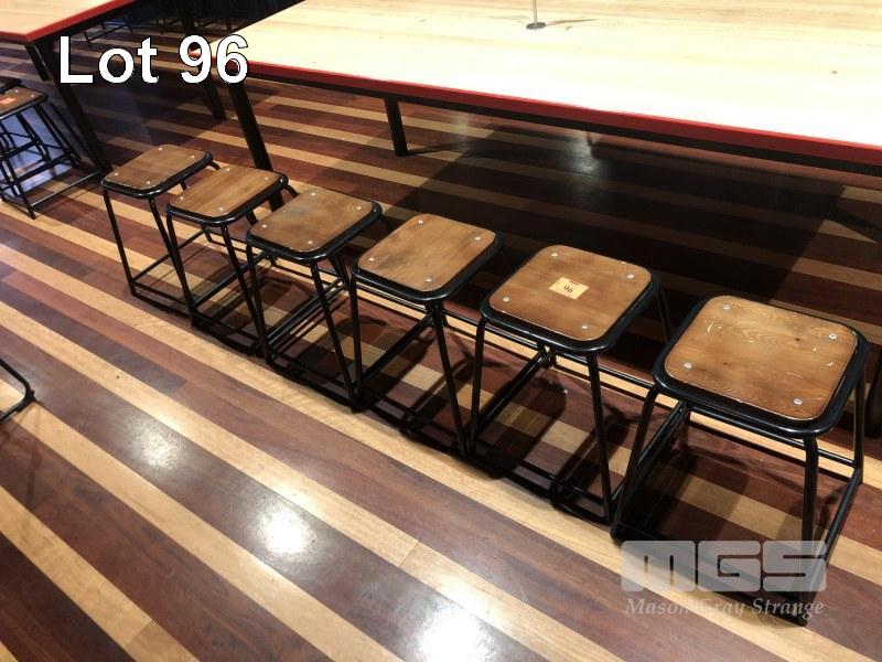 6 x LOW STOOLS, TIMBER TOP, STEEL FRAME