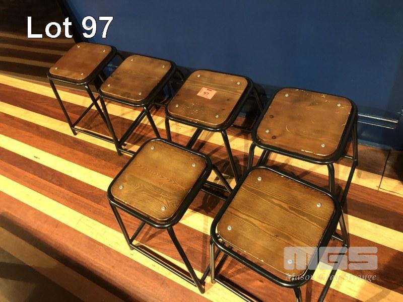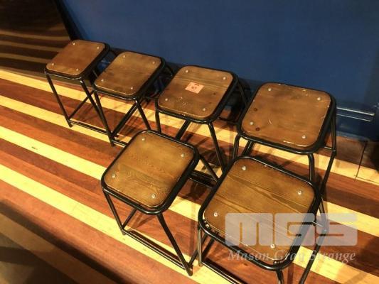 6 x LOW STOOLS, TIMBER TOP, STEEL FRAME