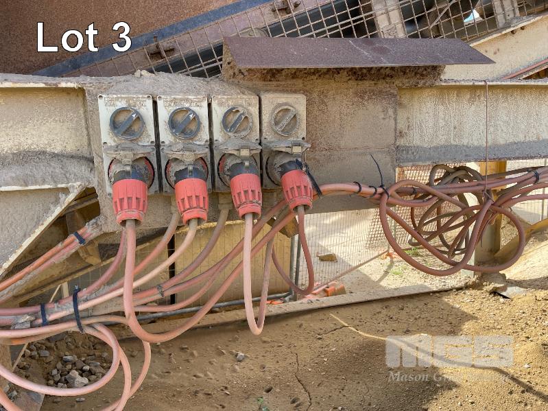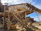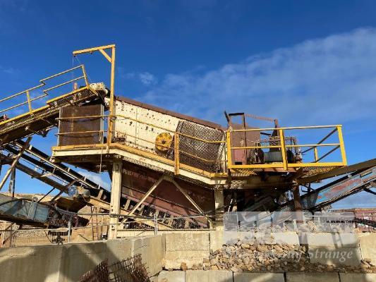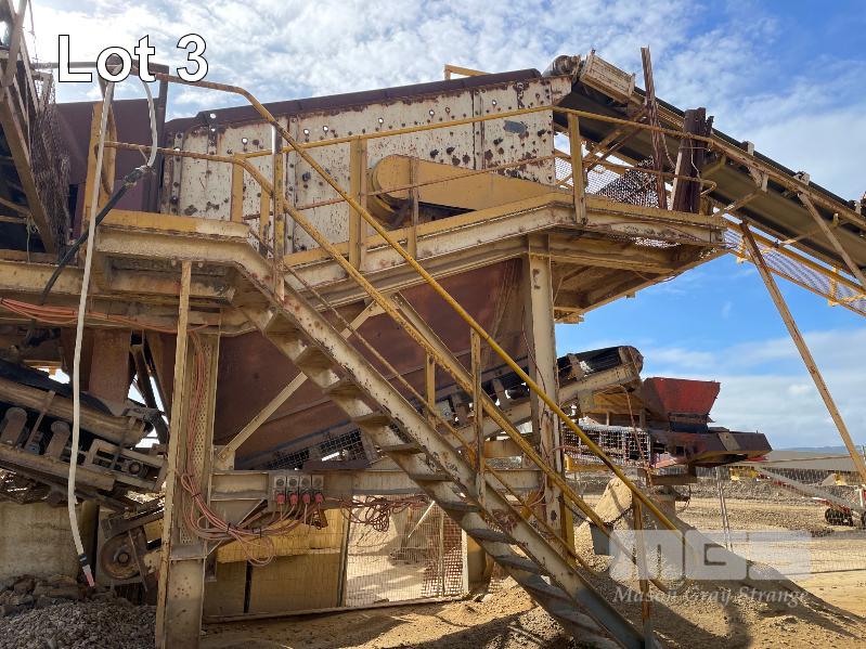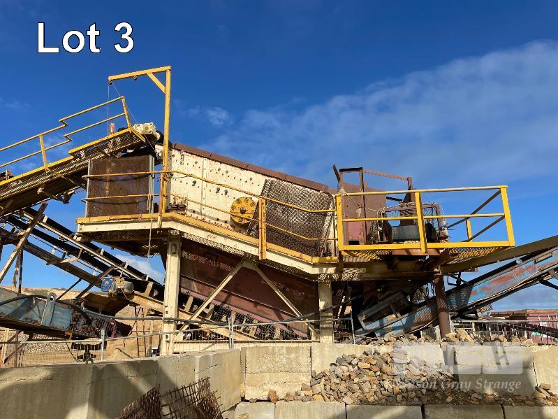 JAQUES TRIPLE DECK SCREEN, 14 FT X 5 FT, INCLINE TYPE MODEL 3514 SNO, 604686 BELT DRIVE 415 VOLT, WITH SUPPORT STRUCTURE, ACCESS STEPS AND WALK WAY ALSO TO INCLUDE BOTTOM DISCHARGE CONVEYOR