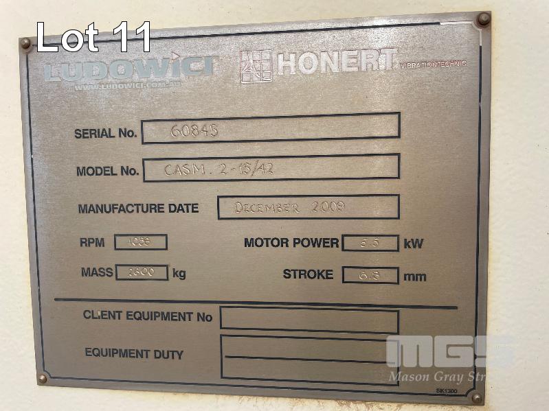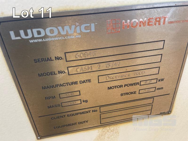 LUDOWICI DOUBLE DECK SCREEN 14 FT X 5 FT MODEL CASM . 2-15/42 DOM 2009 SNO 60845 POWERED BY 5.5 KW 415 VOLT ELECTRIC MOTOR, 1058 RPM, STROKE 6.8 MM WITH SUPPORT STRUCTURE, ACCESS STEPS AND WALK WAYS