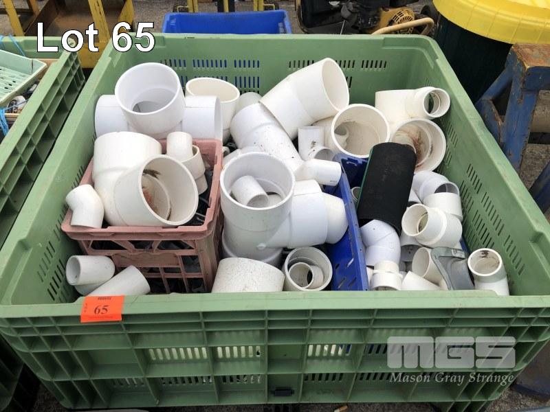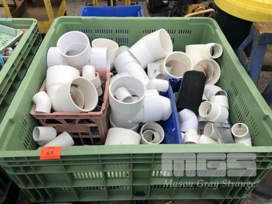 LARGE QUANTITY WHITE PLASTIC PIPE FITTINGS, TEES, ELBOWS, ADAPTORS WITH STOCK BIN