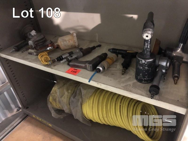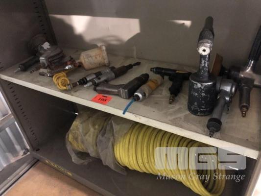PNEUMATIC TOOLS, 4 x SANDERS, SPRAY GUN,GRINDER, TEK GUN, DRILL, LARGE YELLOW HOSE, 1" & AIR RIVETER, CONTENTS 2 x SHELVES