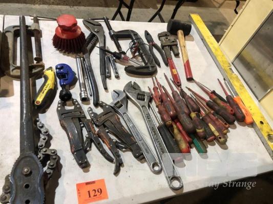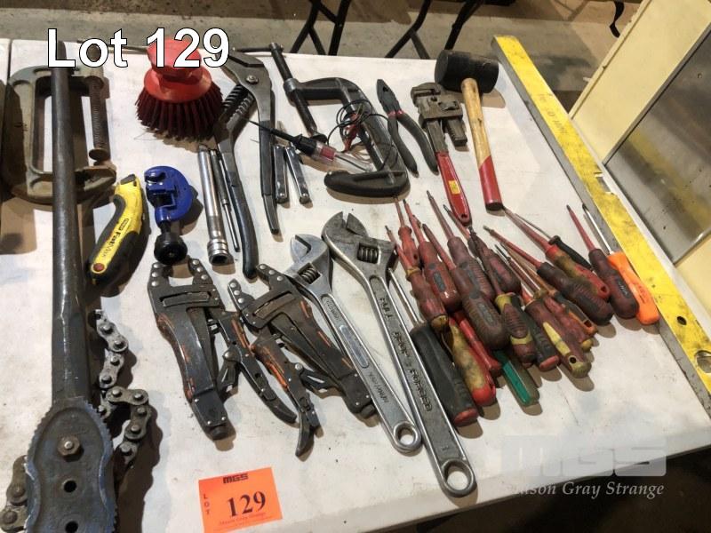 ASSORTED HAND TOOLS, RUBBER MALLETS, SCREWDRIVERS, SHIFTERS, PIPE WRENCH, GRIPS, LEVEL
