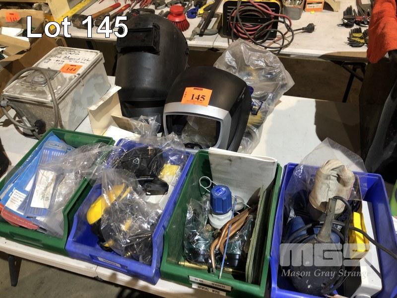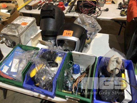ASSORTED WELDING HELMETS, SAFETY SHIELDS & SPARES WITH TUNGSTEN ELECTRODES, UNISAFE PRODUCTS,OXY TIP, REGULATOR, ETC