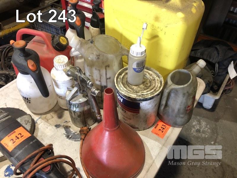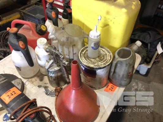 ASSORTED FUEL CONTAINERS, PRESSURE SPRAY BOTTLES, FUNNELS, METAL CLEANERS, GREASE & WATER JUG