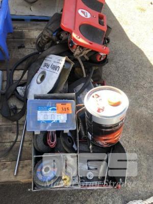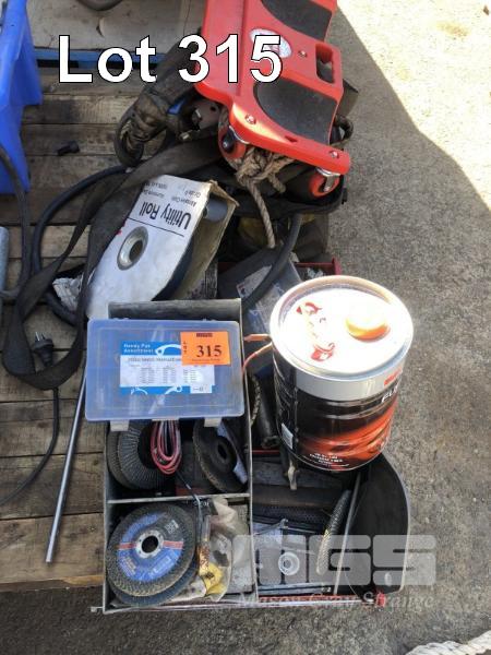 TOOL BAG & TOOLS & TRAY ASSORTED DRILL BITS, DISCS, GRAB KITS, FUEL CAN, TWM KNEE TROLLEY