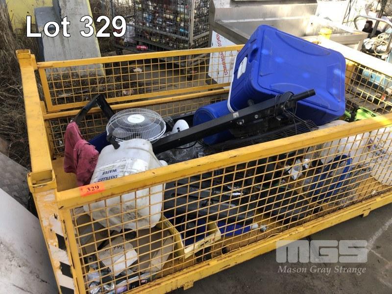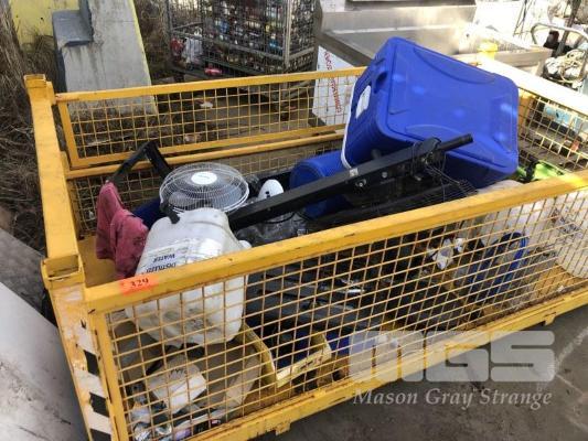 STEEL MESH STILLAGE, YELLOW & CONTENTS ESKY, LIGHTS, DRUMS