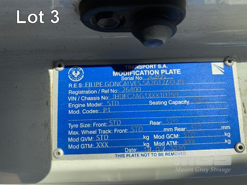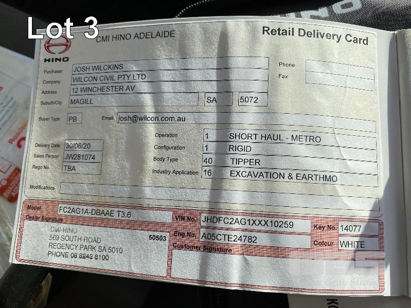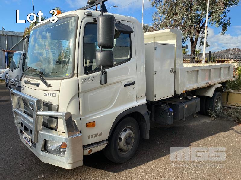 2020 HINO FC 1124, SERIES 500, 4x2 TIPPER TRUCK REG: XS 64 CR VIN: JHDFC2AG1XXX10259 ODO: 38,208kms SHOWING HOURS: 1,470 hours GVM: 11,000kg GCM: 16,000kg 4 CYLINDER TURBO DIESEL, ADBLUE, 6 SPEED MANUAL TRANSMISSION, SPRING SUSPENSION, WHITE DUCO, 2 DOORS, 3 SEAT, AIR CON, CD PLAYER, CB RADIO, BULL BAR, HYDRAULICS, STEEL RIMS, TIPPER HOIST CONTROLS, TOW BALL SAT NAV CRUISE CONTROL ROOF MOUNT HAZARD LIGHTS, BEHIND CAB STORAGE COMPARTMENT SIZE: 700 x 1100(H)mm STEEL TIPPER BODY WITH ROLL OVER TARP, 2 WAY TAILGATE & HINGED SIDES TIPPER BODY SIZE 3600L x 2000W x 500H mm (INTERNAL) KEY #15 (WITH 1 KEY/S, WITH OWNER'S MANUAL, WITH SERVICE BOOKS)