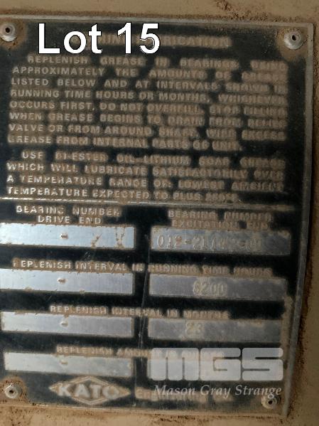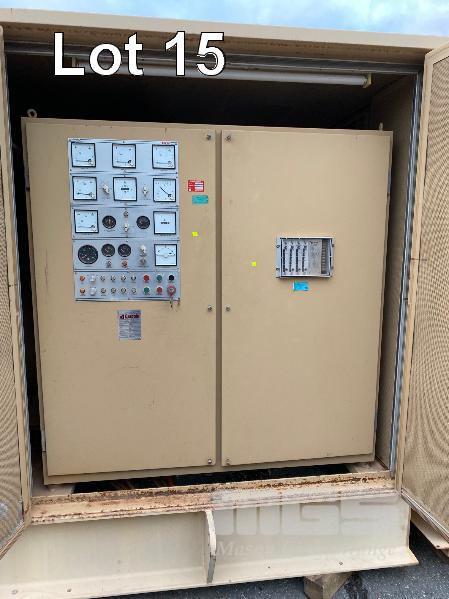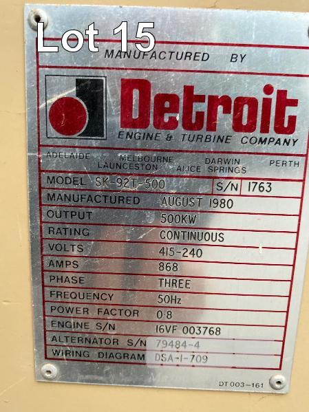 PACKAGED GENSET, 1980 DETROIT MOD: SK-92T-500 OUTPUT: 500kw POWER FACTOR 0.8 (625 KVA) HOURS: 875 SHOWING POWERED BY DETROIT V16 TURBO DIESEL ENGINE MOD: 81637305 S/NO: 16VF003768 WITH KATO ALTERNATOR MOD: 531-493351111 CONTINUOUS OUTPUT: 513kw (641 KVA) VOLTS: 415-240 3 PHASE AMPS: 868 S/NO: 1763 WEIGHT: 13,000kg APPROX