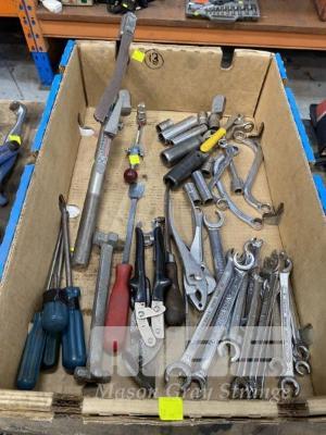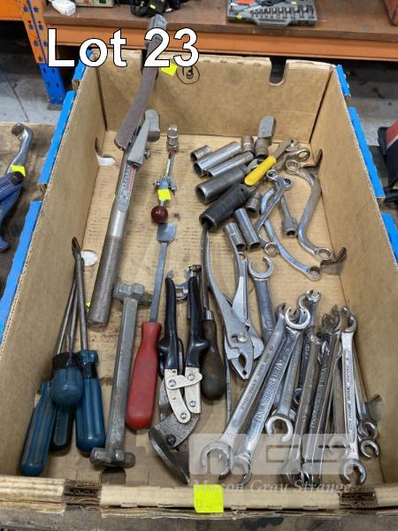2 x TENSION WRENCHES, WARDEN BROWN, 260NM & 20NM, 1/2 & 1/4" DRIVE, ASSORTED SPANNERS, C & S SPANNERS, IMPACT SOCKETS, CUTTERS, ETC, 1 x BOX
