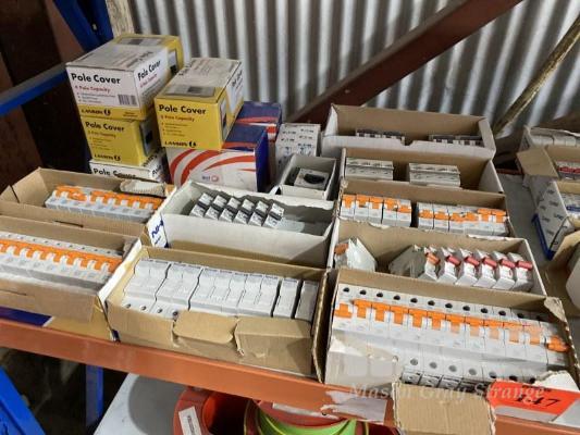 9 x ROLLS ASSORTED CIRCUIT BREAKERS, 6 x BOXES POLY COVERS, ETC