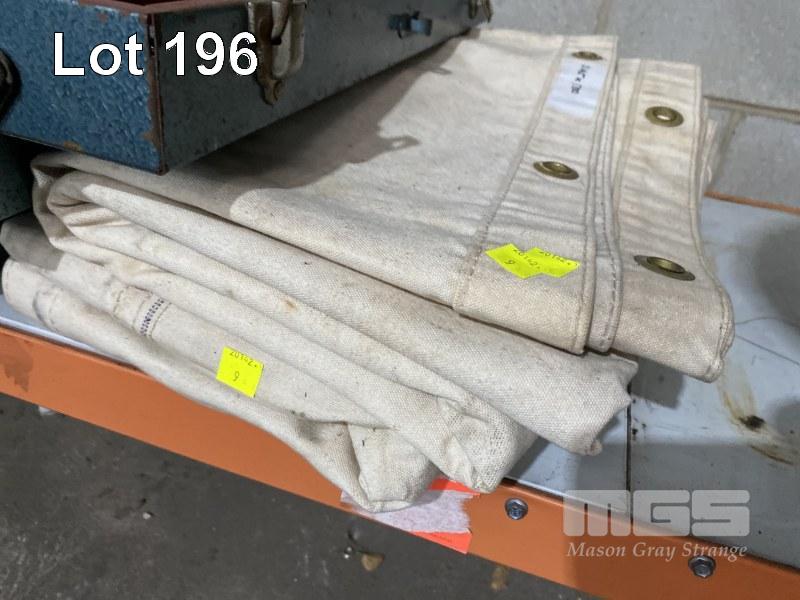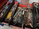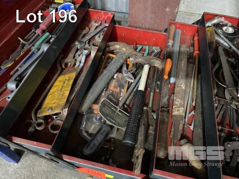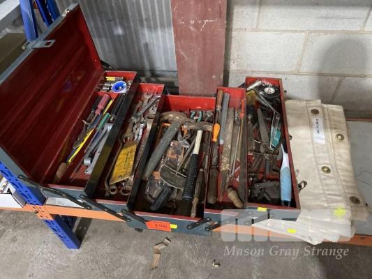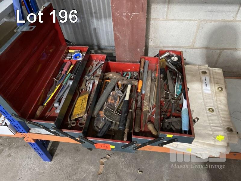 CANTILEVER TOOL BOX & ASSORTED HAND TOOLS INC TORQUE WRENCH, TAP & DIE SET, ENGINEERS CALIPERS, FILES, CHISELS, HAMMERS, RING SPANNERS, ETC & 2 x CANVAS TARPS, 2145 x 1700mm