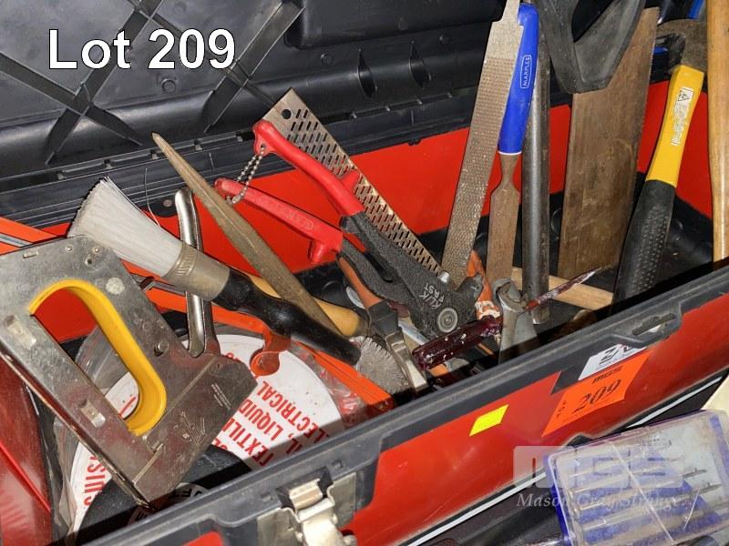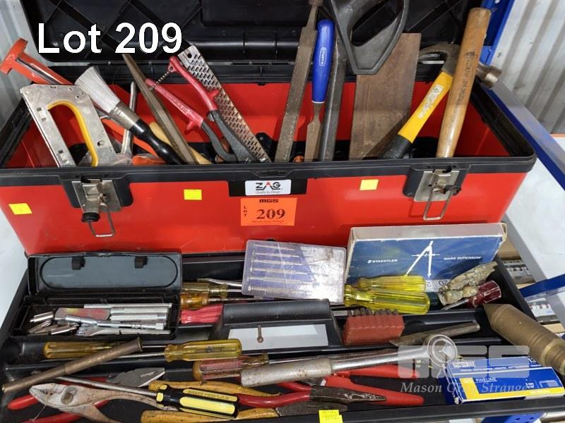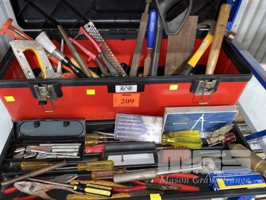 TOOL BOX ZAG & QUANTITY ASSORTED HAND TOOLS, INC RIVET GUN, HAMMERS, CHISELS, DRIVERS, SOCKET WRENCH, PLIERS, CUTTERS, ETC