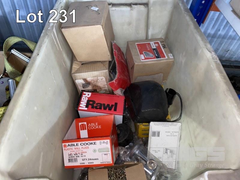 AUTOMOTIVE LIGHTS & PARTS, RATCHET STRAPS, 240V PLUGS, WALL PLUGS, HOSE FITTINGS & NOZZLES, PVC BOTTLES, 1 LITRE CAPACITY & WOODEN HANDLES, ETC,