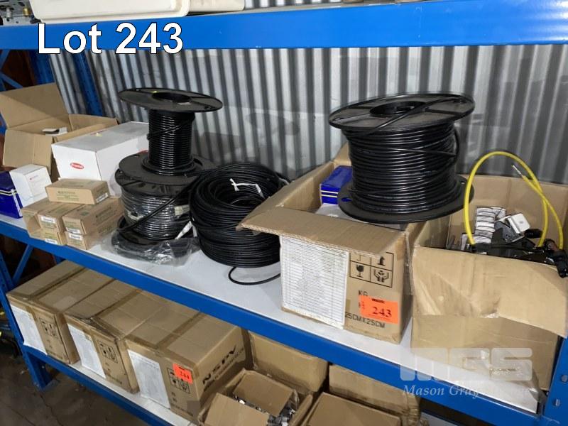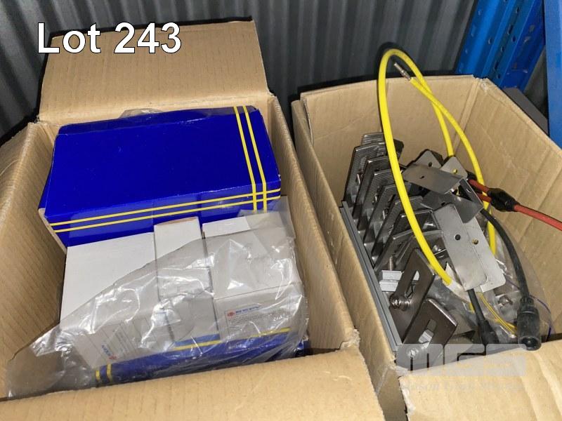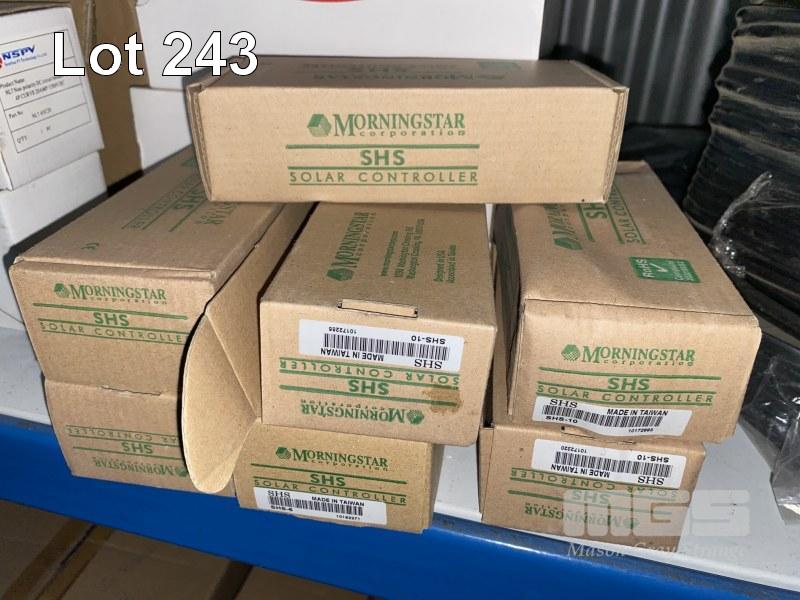 SOLAR INSTALLATION KITS, CABLE, 7 x SOLAR CHARGE CONTROLLERS, ETC, 1 x SHELF