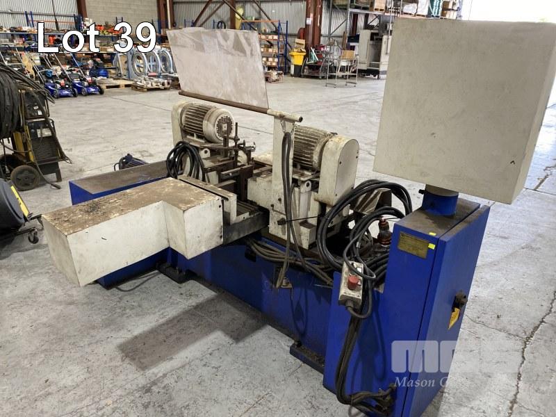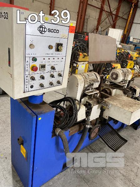 TUBE CHAMFERING MACHINE, SOCO MOD: DEF-FA/60SS+BTM DOM: 2007 WITH AUTO ON PENDANT CONTROL DUAL END CHAMFERING WITH HYDRAULIC POWER UNIT & ELEVATED CONVEYOR UNIT, ROTARY STEEL SLOT/ANGLE FEED 600 (W) TO 1300mm (H), 1400mm (L), 415V, MOBILE WITH ATTACHMENT, ADJUSTABLE WIDTH IN FEED, HEAVY DUTY STEEL CONSTRUCTION