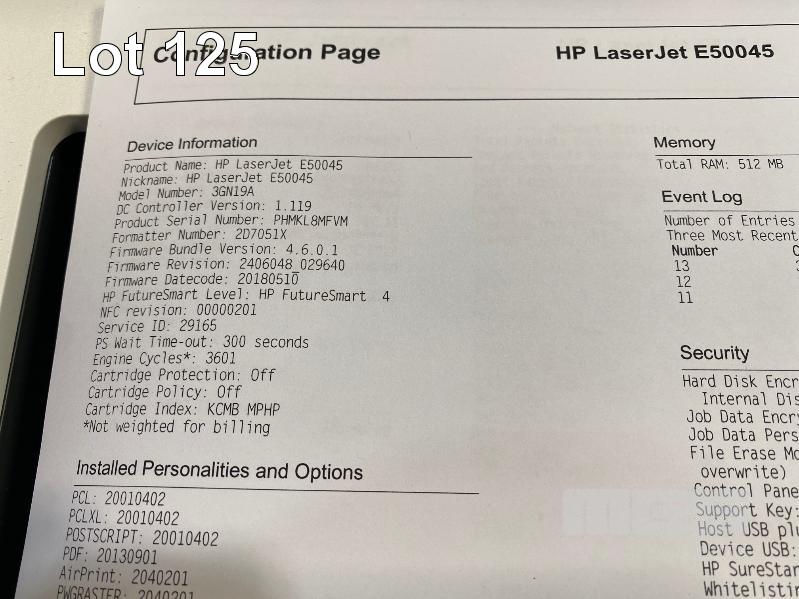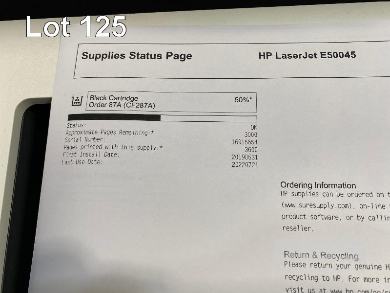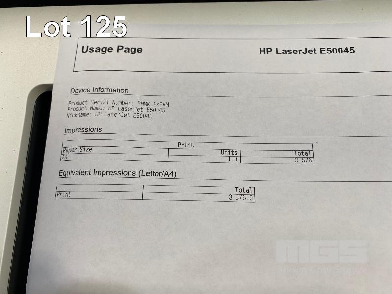 PRINTER, HP LASERJET MANAGED E50045 LASER, 3GN19A, WIRELESS, USB, NETWORK, 3,576 PAGES (TEST PAGE ATTACHED) S/N:PHMKL8MFVM