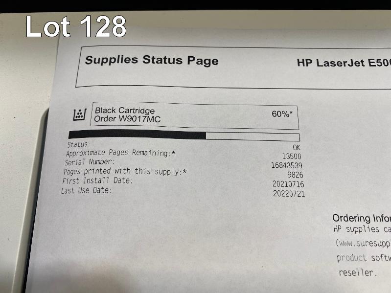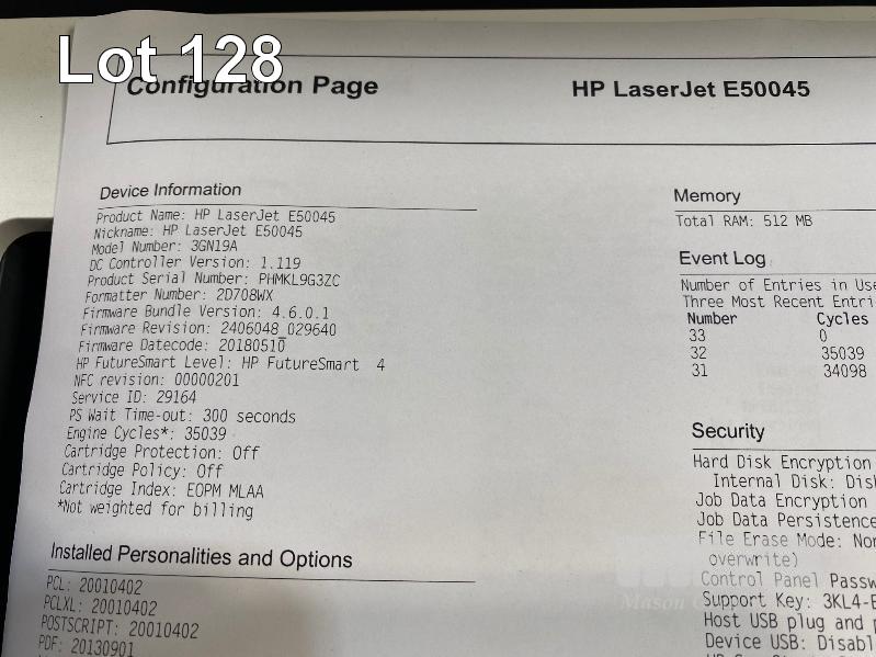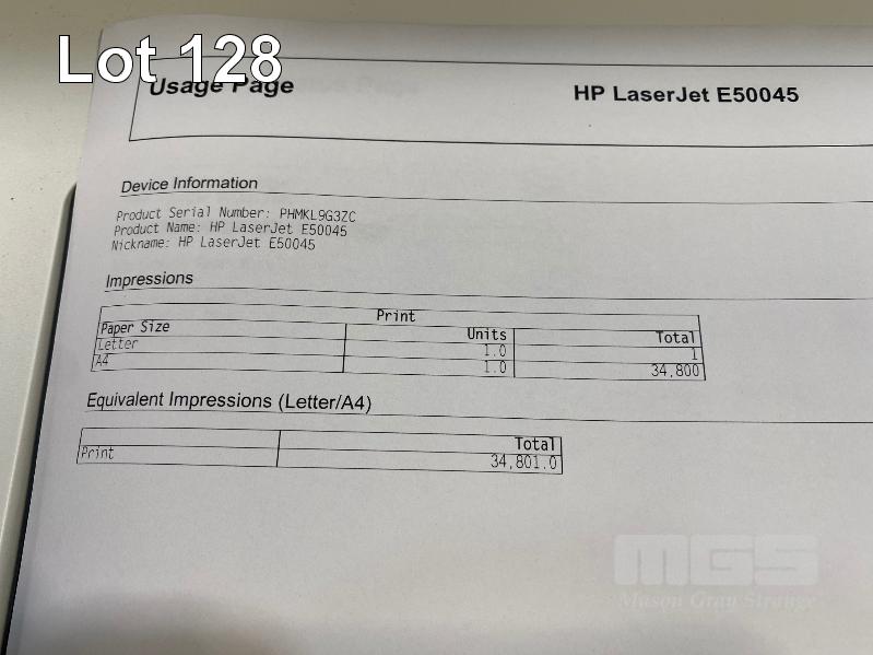 PRINTER, HP LASERJET MANAGED E50045 LASER, 3GN19A, WIRELESS, USB, NETWORK, 34,801 PAGES (TEST PAGE ATTACHED) S/N:PHMKL9G3ZC