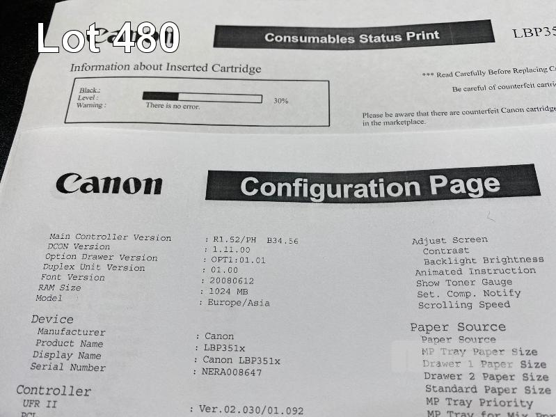 PRINTER, CANON imageCLASS LBP351x LASER, USB, NETWORK, 62,457 PAGES (TEST PAGE ATTACHED) WITH ADDITIONAL PAPER TRAY S/N:NERA008647