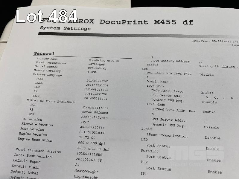 PRINTER, FUJI XEROX DOCUPRINT M455 df LASER, ADF, USB, NETWORK, 6,482 PAGES (TEST PAGE ATTACHED) S/N:ZTZ505491