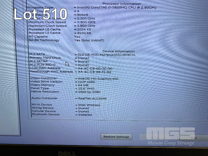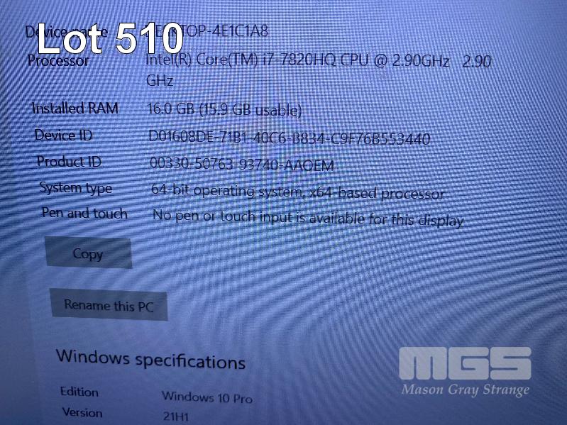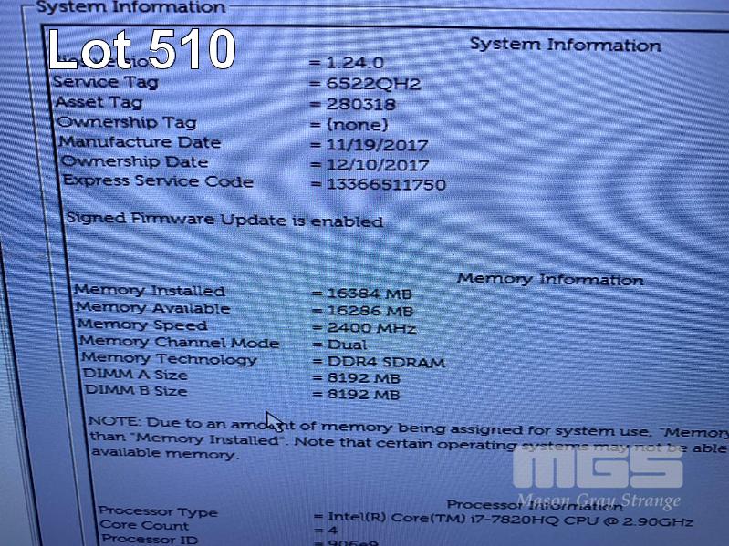 LAPTOP, DELL PRECISION 3520 WORKSTATION, CORE i7 7820HQ (7TH GEN) @ 2.9GHz, 16GB DDR4 RAM, 512GB M.2 SSD, 15.6" WIDESCREEN (1920x1080), INTEL HD GRAPHICS 630, 2GB NVIDIA QUADRO M620 VIDEO, Wi-Fi, BLUETOOTH, WINDOWS 10 PRO INSTALLED & POWER SUPPLY (NOTE: SCREEN HINGES LOOSE, MARKS ON SCREEN, DAMAGE TO BOTTOM OF CASING, SWOLLEN BATTERY) S/N:6522QH2
