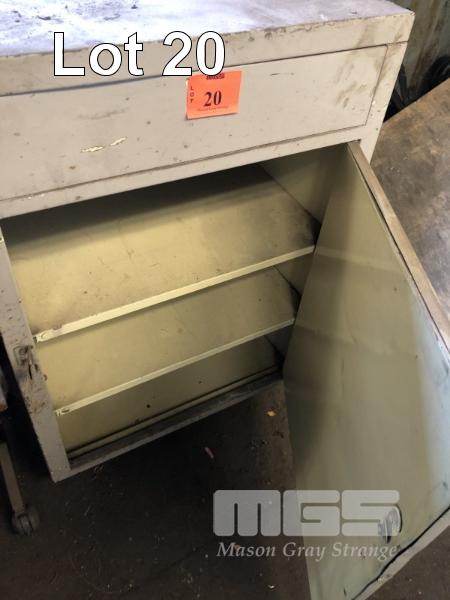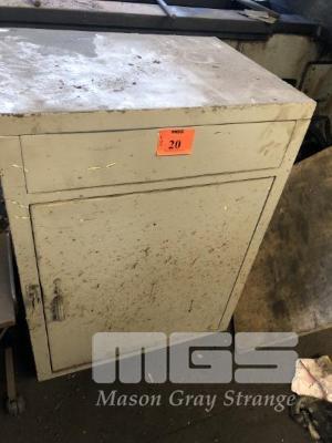 STEEL STOCK CUPBOARD, 1 x DOOR/DRAWER & CONTENTS, ARLEC 12v BATTERY CHARGER & JUMPER LEADS