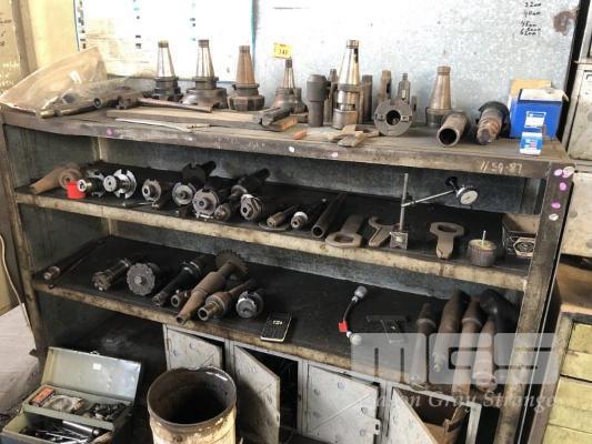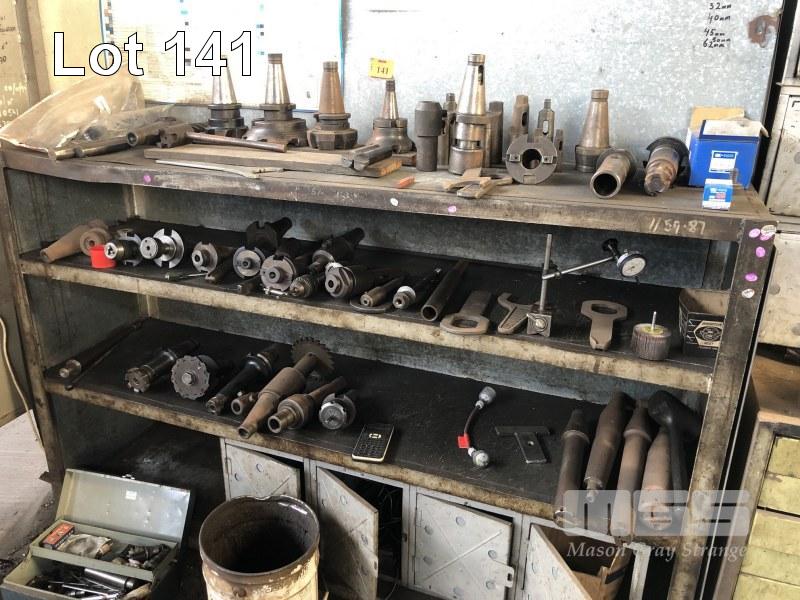 LARGE QUANTITY INT FACE CUTTERS, TOOL HOLDERS, DRILL CHUCKS, ASSORTED BORING BARS INCLUDING 4 TIER HEAVY DUTY STOCK RACK