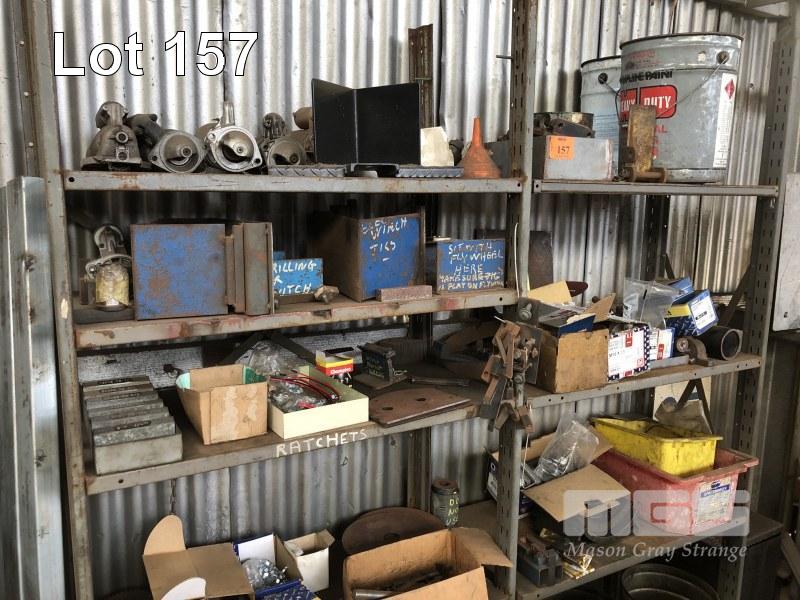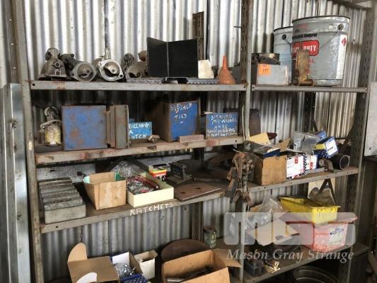 RACK & CONTENTS ASSORTED HARDWARE, NUTS, BOLTS, GREASE NIPPLES, ROLL PINS, DRILL BITS, REAMERS