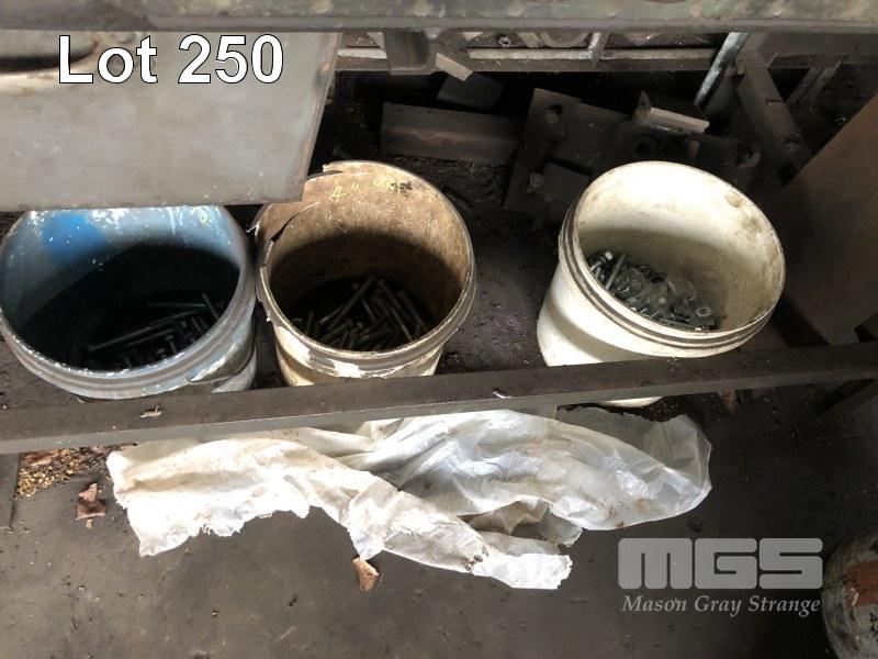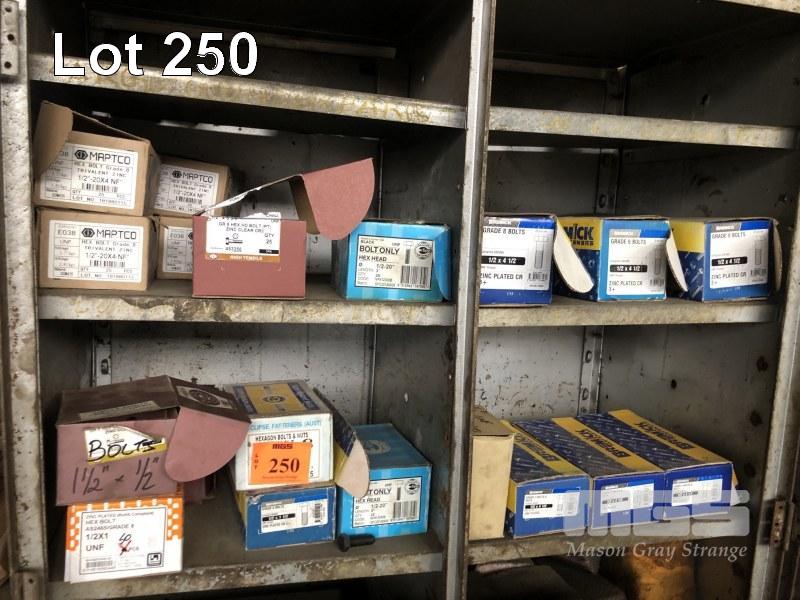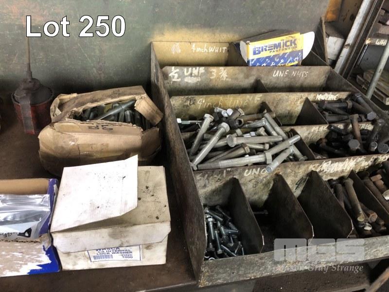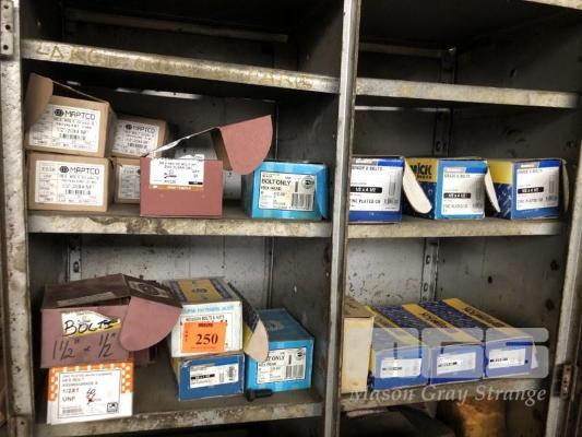 ASSORTED HARDWARE, CARTONS NEW BOLTS, NUTS, WASHERS, INCLUDES TRAY & BUCKETS OF ITEMS