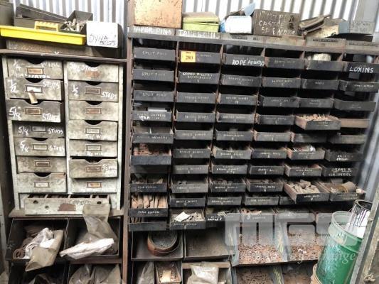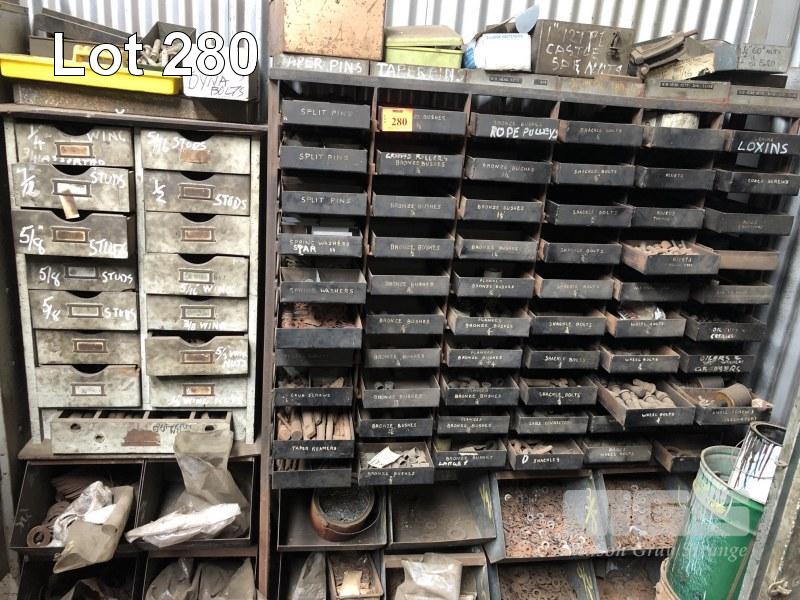60 x PARTS TRAY RACK & CONTENTS, NUTS, WASHERS, SPLIT WASHERS, SPLIT PINS, WHEEL STUDS, PLUS WOODEN DRAWERS & CONTENTS