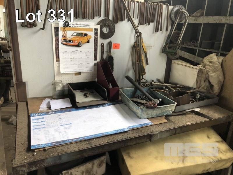 HEAVY DUTY STEEL BENCH & CONTENTS, 3 TIER, 1530 x 740mm WITH DRILL BITS & HAND TOOLS