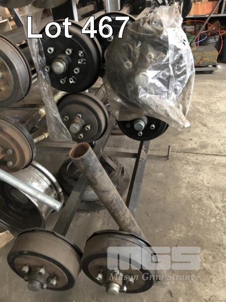 8 x TRAILER AXLES INC 2 x ROUND 66" WITH BRAKES 6 x SQUARE WITH BRAKES, 77", 41", 59", 67", 95"