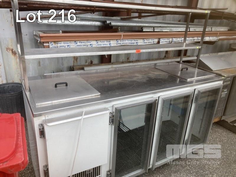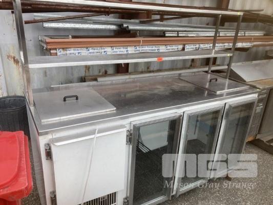 3 DOOR DISPLAY FRIDGE, 213 X 85 CM, 240V W/ 2 TIER OVERSHELF