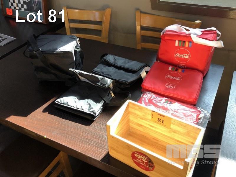 6 x PROMOTIONAL COOL BAGS, BLACK & COCA-COLA & COCA-COLA STRAW BOX