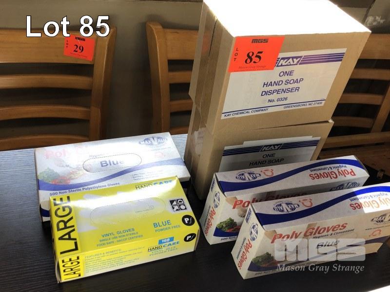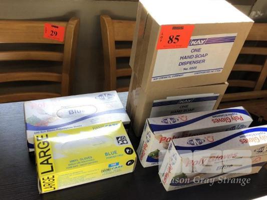 3 x BOXES POLY GLOVES, 1 x BOX VINYL GLOVES & 2 x BOXES HAND SOAP DISPENSER