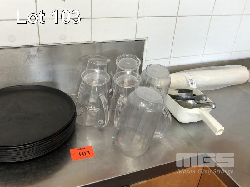 9 x WAITERS TRAYS, 6 x PLASTIC JUGS, 50 PACK DETPAK CUPS & 5 x PRODUCT SCOOPS