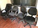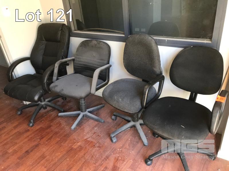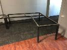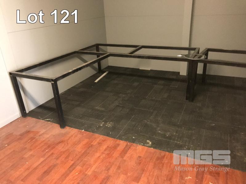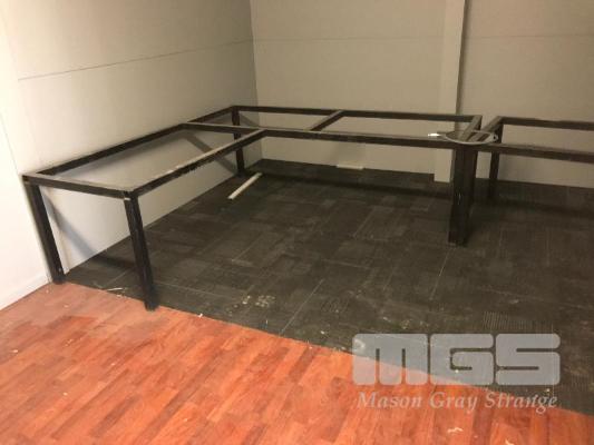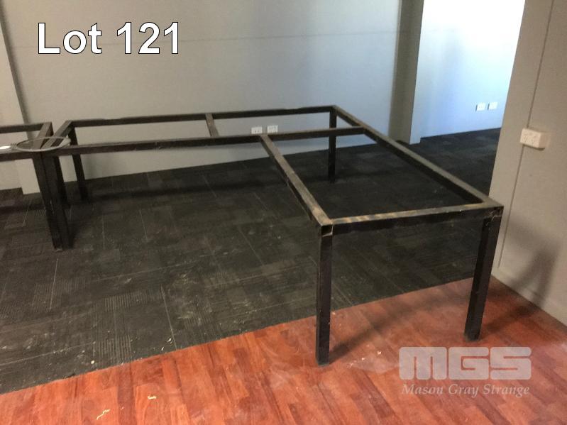 PAIR CORNER TABLE FRAMES, 4 x GAS LIFT CHAIRS & STEEL FRAMED BENCH