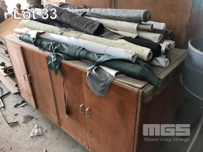 ASSORTED FLAT BED TROLLEYS, TIMBER 4 DOOR CABINET & ASSORTED ROLLS FABRIC REMNANTS