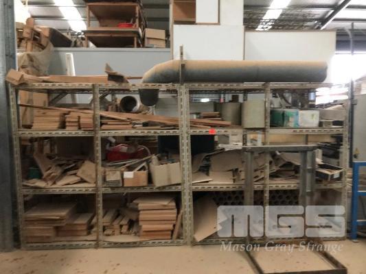 7 x BAY SLOTTED ANGLE IRON SHELVING & CONTENTS SUNDRY TIMBER COMPONENTS & EQUIPMENT