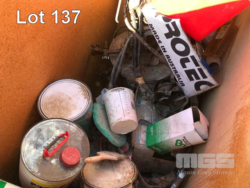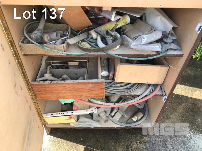 PNEUMATIC SPRAY POT & GUN, SPRAY CHEMICALS, INC THINNERS, ETC & SINGLE DOOR CABINET, CONTAINING MACHINE PARTS & SPARES