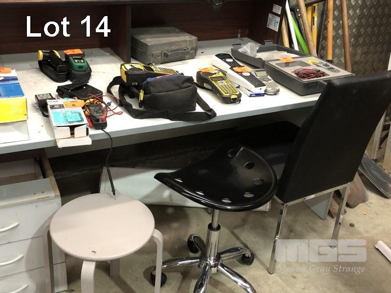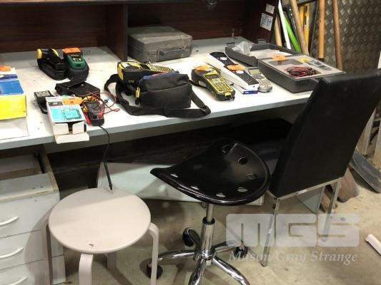 WAREHOUSE DESK WITH HUTCH 1800 x 900mm WITH TECHNICIANS STOOL & DRAWER SET AND OFFIC E CHAIR.