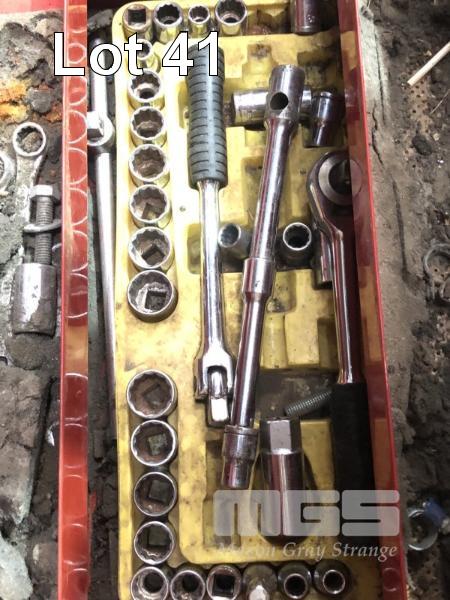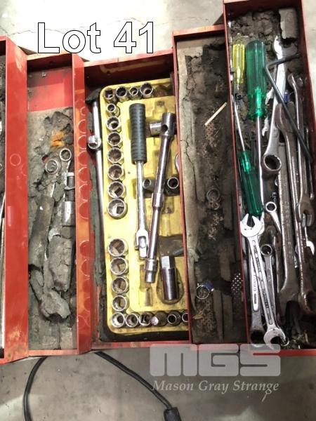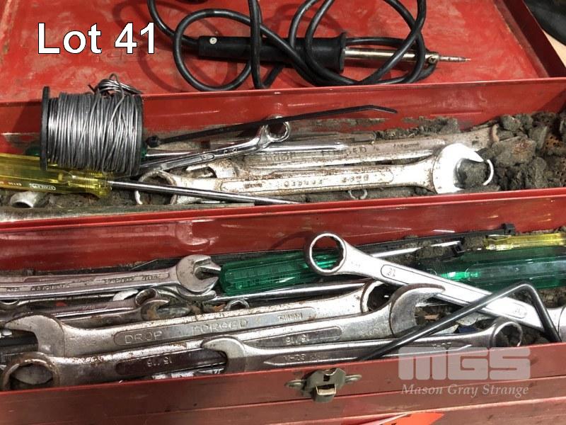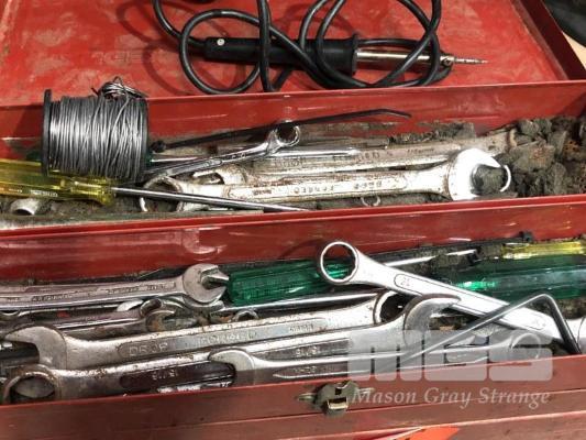 CANTILEVER TOOL BOX, SOCKET SET, SPANNERS, SCREWDRIVERS & SOLDERING IRON