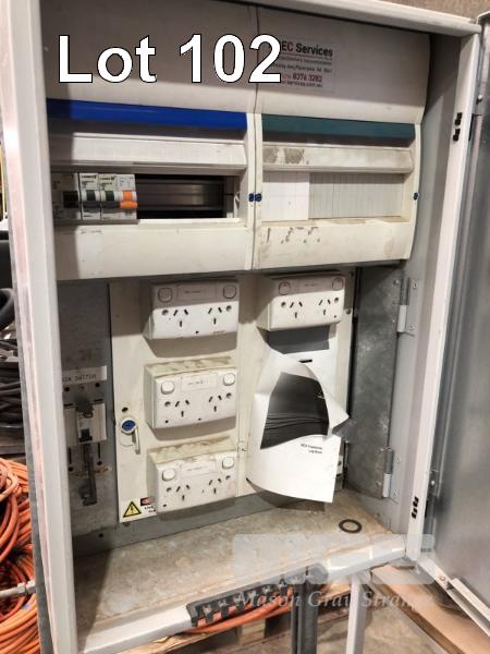 ELECTRICAL POWER SITE BOX, 240v ON STAND, CIRCUT BREAKERS, MAIN SWITCH, 4 x GPO'S