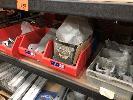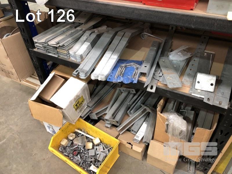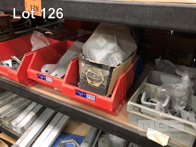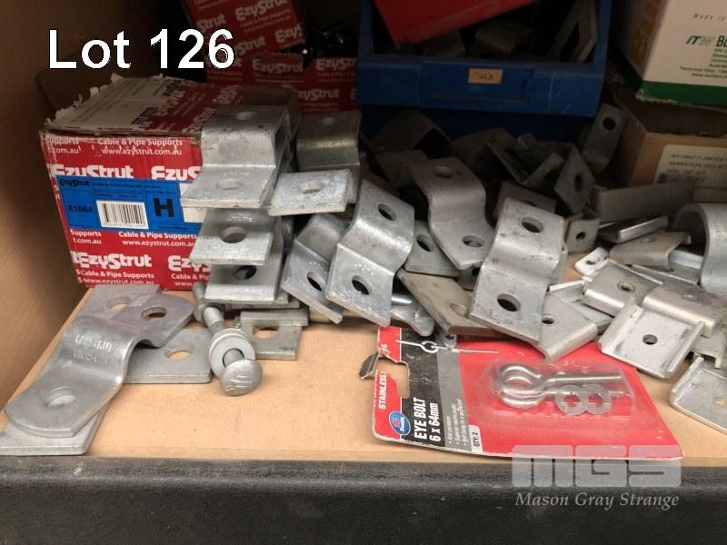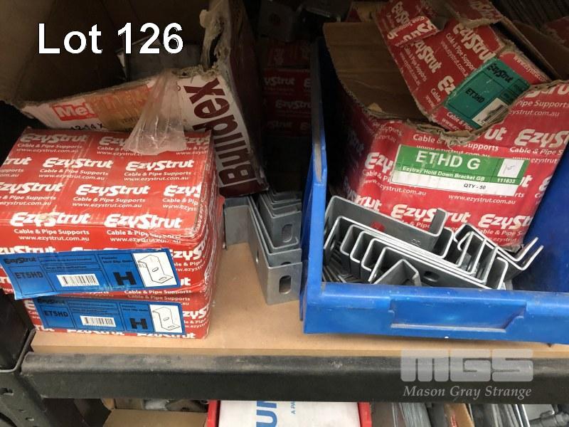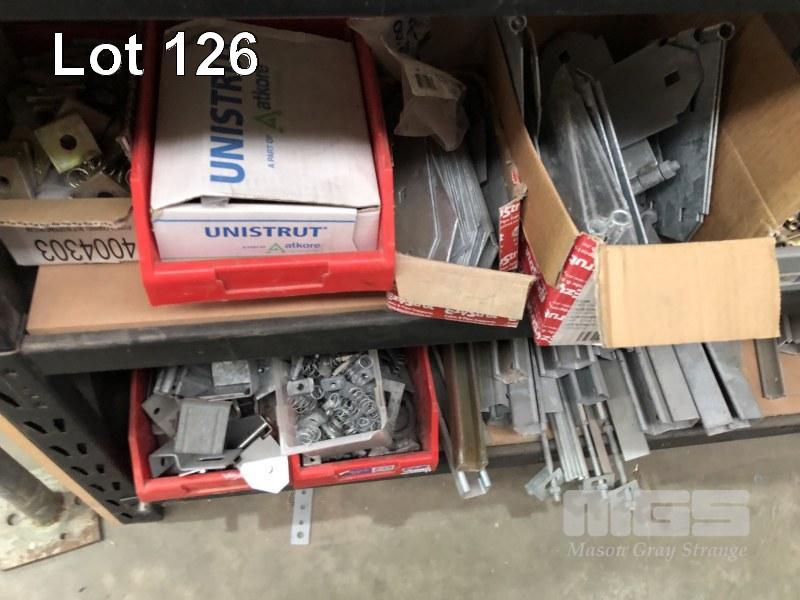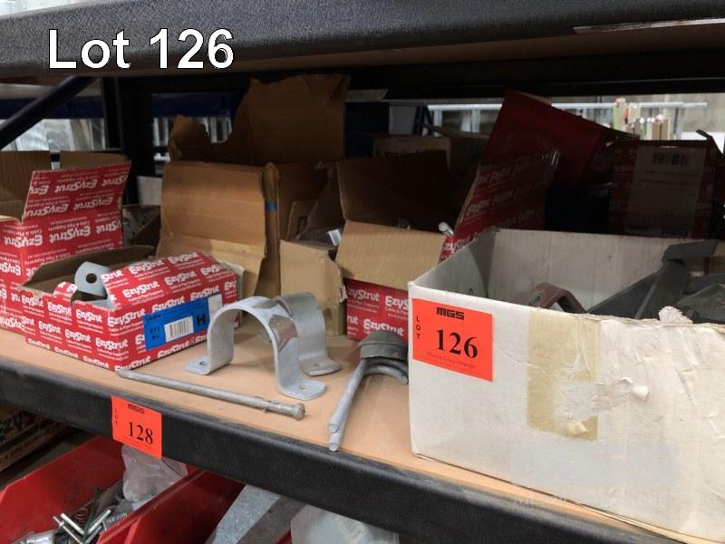 CONTENTS OF 5 SHELVES, EZY STRUT FITTINGS, VARIOUS CLAMPS, HARDWARE, CAPS ETC.