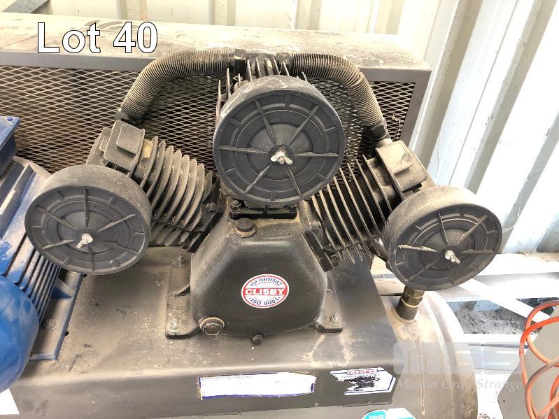 CLISBY AIR COMPRESSOR, 3 CYLINDER, 7.5kw, APPROX 30cfm, TANK SIZE 1200 x 450mm, 415v WITH AIR HOSE & DUST GUN