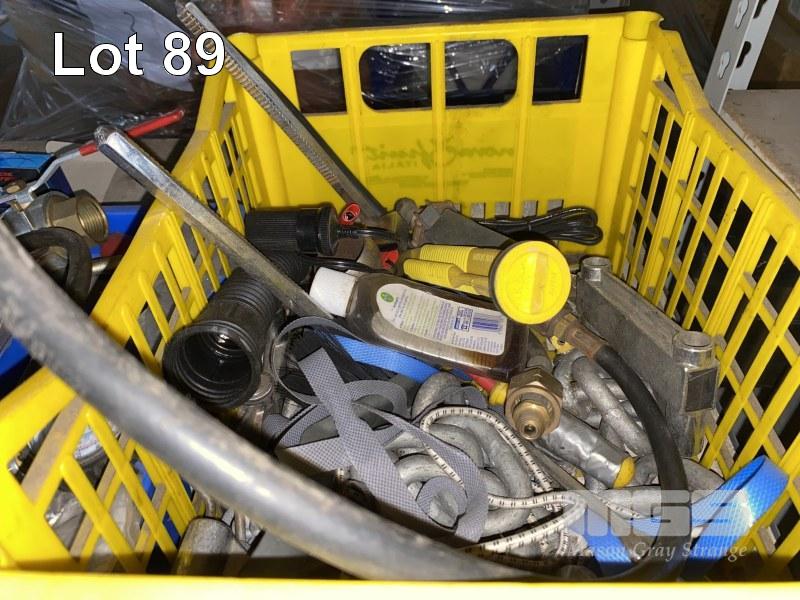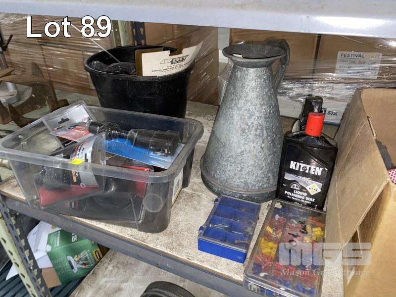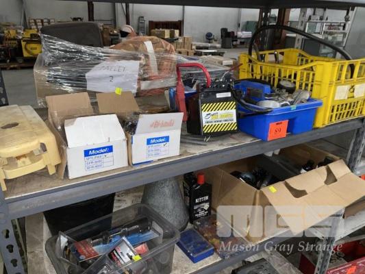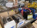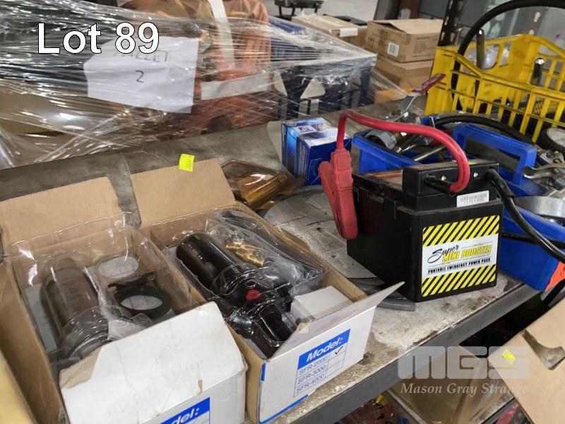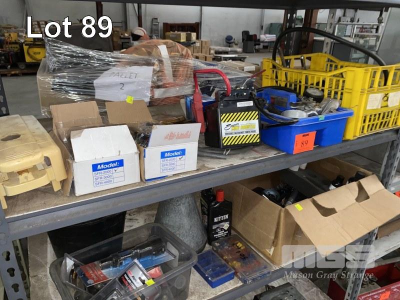 ASSORTED AUTOMOTIVE PARTS, TOOLS, POWER PACK, OIL JUG, ETC