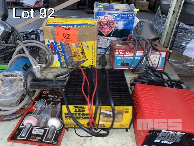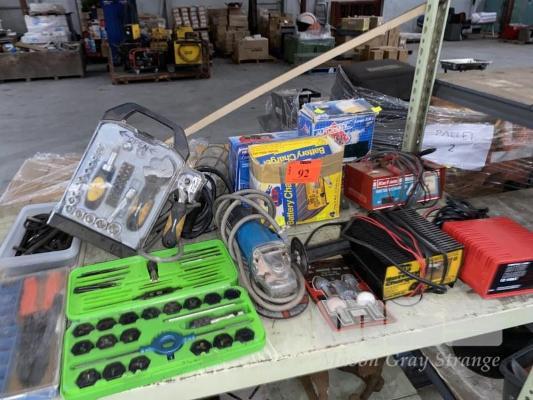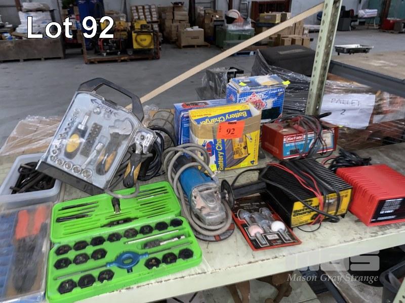 4 x BATTERY CHARGERS, ARLEC, LEP & KAR MATE, 240V, ANGLE GRINDER, TAP & DIE SET, SOCKET SET, ETC